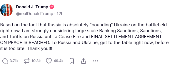 Trump wrote in a post on Truth Social, “Based on the fact that Russia is absolutely “pounding” Ukraine on the battlefield right now, I am strongly considering large-scale Banking Sanctions, Sanctions, and Tariffs on Russia until a Cease Fire and FINAL SETTLEMENT AGREEMENT ON PEACE IS REACHED.”