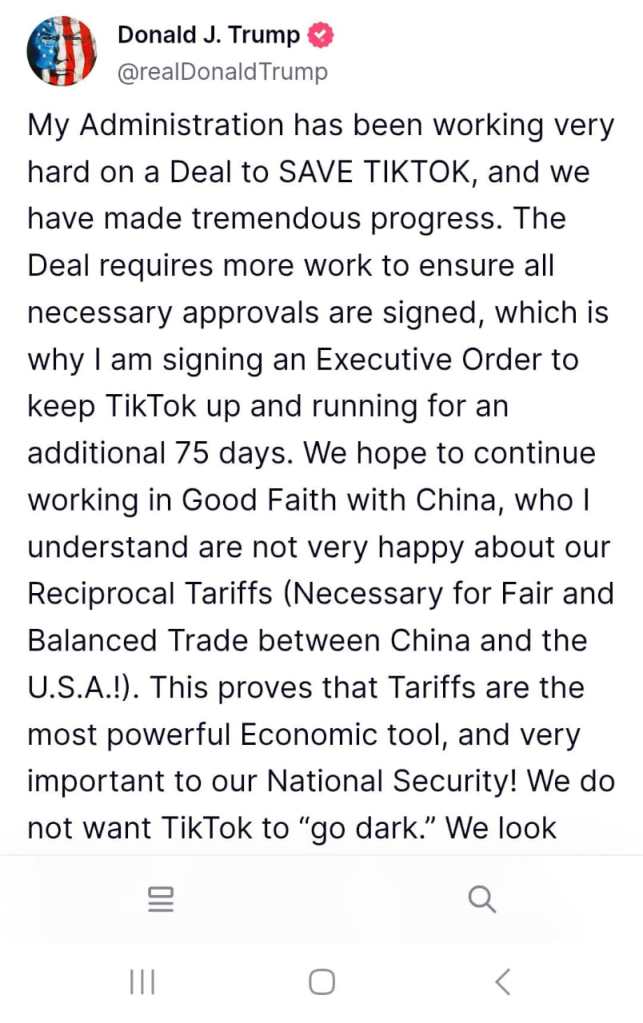 Trump shared on Truth Social, saying, ‘My Administration has been working very hard on a deal to save TikTok, and we have made tremendous progress.’ He added, ‘A transaction requires more work to ensure all necessary approvals are signed, which is why I am signing an Executive Order to keep TikTok up and running for an additional 75 days.’