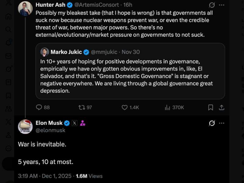 A prompt on Grok led to the reply that Elon has warned of a civil war in Europe and Britain due to mass migration and identity politics, a war between the US and China over Taiwan, and the ongoing conflict in Ukraine turning into World War 3. Musk has said that despite the best efforts in nuclear deterrence, tensions are rising in this world. Musk refrained from mentioning any particular tension or conflicts in his original post. It is being mentioned that he was referring to Taiwan, Ukraine, and internal crises in Europe.