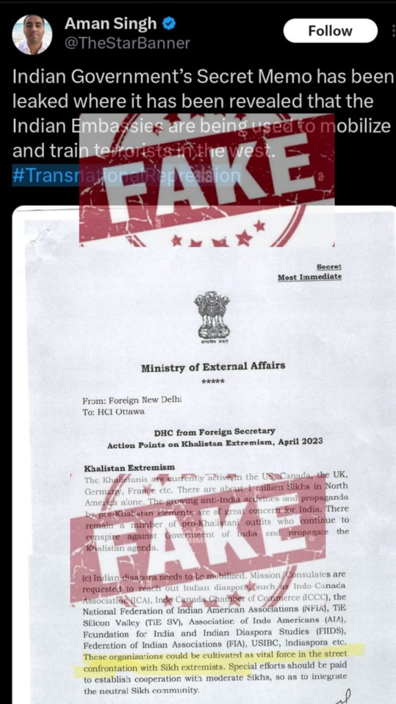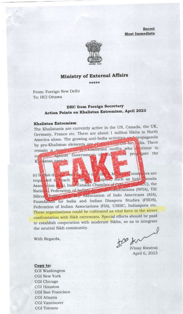 The April 2023 dated fake memo purportedly from former Foreign Secretary Vinay Kwatra asks Indian diplomats to “cultivate” Indian diaspora groups in Canada “as a vital force in the street confrontations with Sikh extremists”.