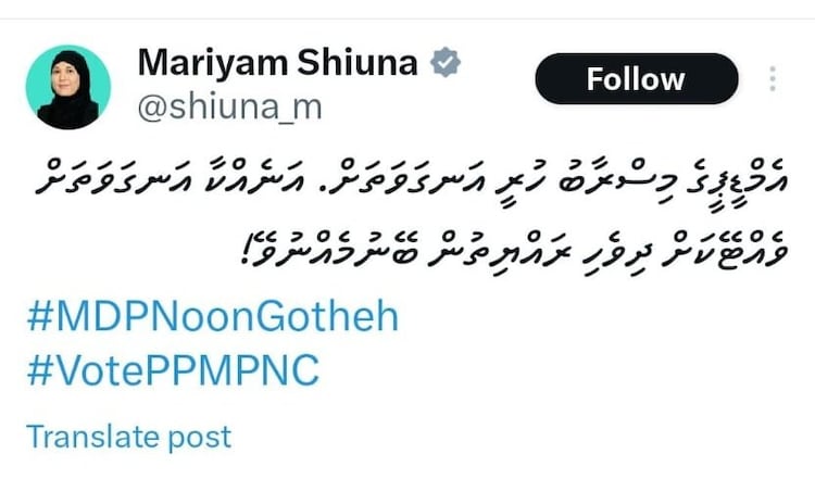 Mariyam Shiuna, a member of Maldives President Mohamed Muizzu’s ruling party, utilized her now-deleted social media post to advocate for votes for her party. The post stated, “The MDP is heading towards a big slip. The people of Maldives don’t want to fall and slip with them.”
