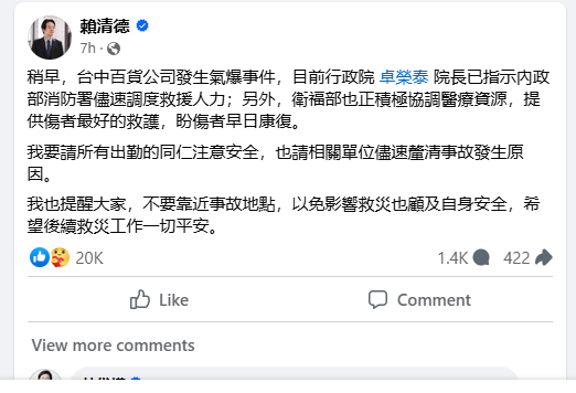 President Lai Ching-te of Taiwan wrote on his Facebook page about the incident. He said, “Earlier, a gas explosion occurred at a department store in Taichung. Currently, Premier Su Tseng-chang has instructed the Ministry of the Interior’s Fire Department to quickly mobilize rescue teams. Additionally, the Ministry of Health and Welfare is actively coordinating medical resources to provide the best care for the injured, hoping for their swift recovery. I ask all responding personnel to be mindful of their safety and request that relevant agencies promptly clarify the cause of the incident. I also remind everyone not to approach the accident site to avoid hindering rescue efforts and to ensure personal safety. I hope the ongoing rescue operations proceed smoothly and safely.”