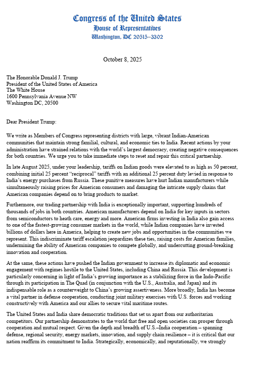 “American manufacturers depend on India for key inputs in sectors from semiconductors to health care, energy, and more. American firms investing in India also gain access to one of the fastest-growing consumer markets in the world, while Indian companies have invested billions of dollars here in America, helping to create new jobs and opportunities in the communities we represent. This indiscriminate tariff escalation jeopardizes these ties, raising costs for American families, undermining the ability of American companies to compete globally, and undercutting ground-breaking innovation and cooperation,” the US Lawmakers emphasized