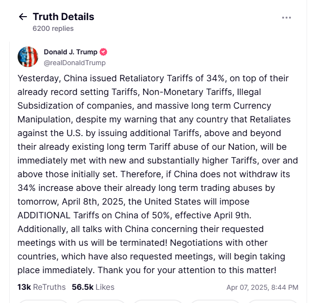 Earlier on Sunday, Trump had threatened an additional 50 per cent hike in tariffs on China. This came after China announced 34 per cent retaliatory tariff hike. Meanwhile, a spokesperson from China’s Ministry of Commerce described the US tariffs imposed on the country as “groundless.” He criticised them as a form of unilateral bullying practice.