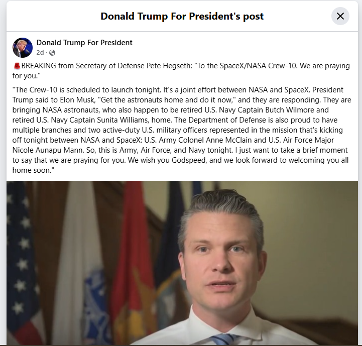 “President Trump said to Elon Musk, ‘get the astronauts home and do it now’ – and they’re responding,” Hegseth said. “And they’re bringing NASA astronauts, who also happen to be retired US Navy Captain Butch Wilmore and retired US Navy Captain Sunita Williams, home,” Hegseth added.