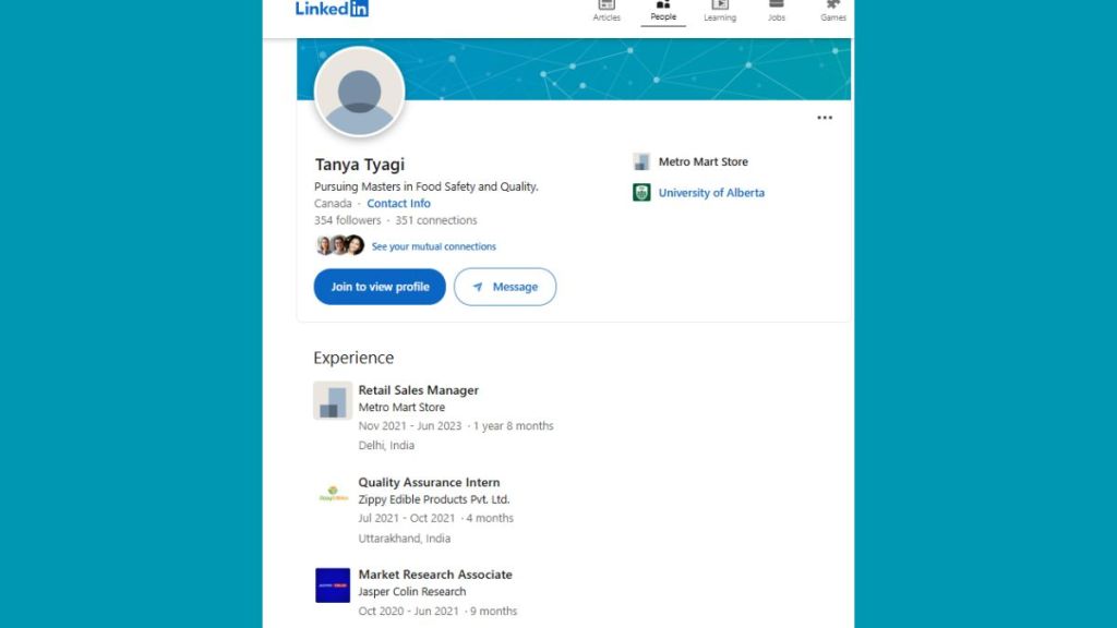 Tanya Tyagi, an Indian student was studying in University of Alberta. According to her LinkedIn profile, she was pursuing Masters in Food Safety and Quality. She had earned a BTech degree from Jaypee Institute of Information Technology. Tanya had worked as Retail Sales Manager in Metro Mart Store for 1 year 8 months. She was Quality Assurance Intern at Zippy Edible Products Pvt. Ltd.